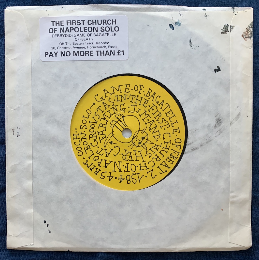 As I’ve mentioned plenty of times in the short history of this blog, Johan Kugelberg’s Top 100 DIY records list from Ugly Things magazine was a huge TURNING POINT for me as a music fan and collector. Not only did I learn so much from hunting down the records on that list but it led me into dozens of new directions musically and aesthetically when it came to looking for new things to check out. One record that isn’t on that list but absolutely could have come in at #101 is the sole release by UK band First Church of Napoleon Solo, the “Debbydid” 7″ on the Off the Beaten Track label from 1984. Every copy of this record (as far as I can tell) has a hand-painted sleeve using what looks like some kind of ink block or possibly a very poorly made stencil and a single printed title sticker on the opposite side. I found my first copy on eBay after having a “saved search” for years. I think I found another one after seeing it on a set sale list. It wasn’t in the Discogs database for years and when it finally appeared copies popped up now and then for usually less than £10. And I bought ALL of them. And each time I did I thought of the Turning Point guy. The main difference was, as far as I could tell no one seemed to be looking for this 7″ except for me. For the longest time I’ve bought cheap copies of random obscure records that I like just to give away to friends or trade, but up until about a year ago I never parted with even ONE copy of this record. I even turned down a few people who offered to buy one from me. I can rationalize that I’ve kept them all because every cover is unique and blah blah blah but….c’mon. Anyway, I have a whole stack of ’em. none are for sale, and here’s the Mutant Sounds guys telling you what it sounds like followed by a bunch of the covers from my collection. I have no idea how many were pressed, I don’t know if these guys did anything else aside from one song on a Belgian cassette compilation from 1983 under a different name……Enjoy!
