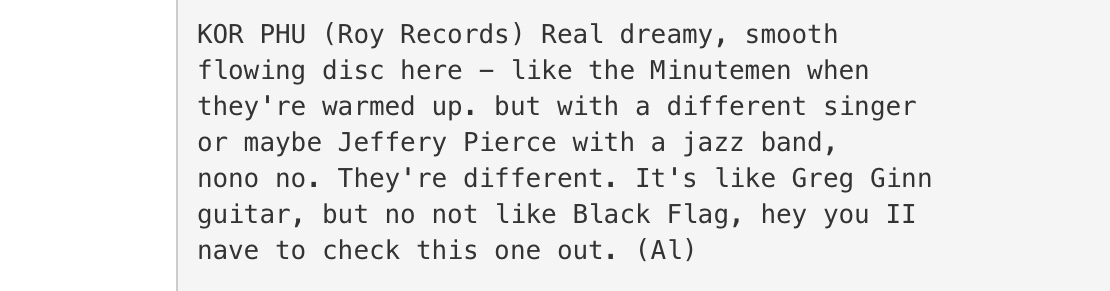All that said, when you’re digging on the internet for information on a band like Kor-Phu who released one record in 1984 in Albuquerque, New Mexico, the fact that there’s so little information available makes you wonder why there’s so little documentation out there, even though, according to one site, Kor-Phu was “the winner of Wolfman Jack’s National Battle of the Bands competition in 1982”. So, I guess when I hear a record like this, see where they’re from, how little info is available and try to put them into perspective musically, I’m just assuming Kor-Phu was one of those bands that heard and/or saw Black Flag and decided “let’s do THAT.”